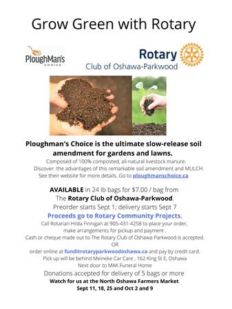 In the spring and fall of 2021 , the Rotary Club of Oshawa-Parkwood sold 25 pound bags of Ploughmans Choice manure to the gardeners of Durham Region.