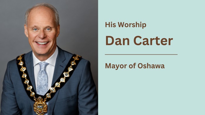 Dave Andrews introduced Mayor Carter. Although Dan asked Dave to make the intro short, Dave just could not comply! Dave reminded us of Mayor Carter’s professional speaking and leadership, his love of life-long learning, and his political career before becoming mayor in 2018. We also learned that Carter lends his time to many philanthropic endeavours, such as The Day of Hope, which raised money for the Carea Community Health Centre. Mayor Carter is the recipient of many honours and awards, including Businessman of the Year by both Whitby Chamber of Commerce and Greater Oshawa Chamber of Commerce. He received the CAMH “Courage to Comeback” award, and he received both the Queen’s Golden and Diamond Jubilee Medallions. Carter assists our club in many ways, and he is an honorary member of the Rotary Club of Oshawa. Dave ended by saying, “Dan is committed to leading in a way that will bring out the best in all of us, and be the light that brings hope, optimism, and pride to this great city.”
