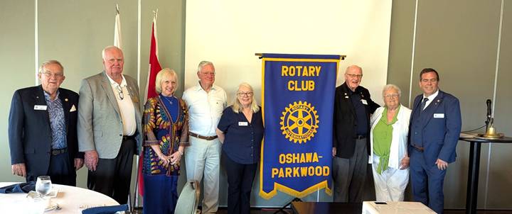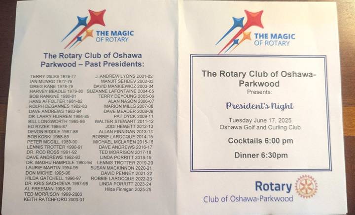 A message from (now) Past President Hilda Finnigan “It has been my privilege to serve as President of the Rotary Club of Oshawa Parkwood for the past year 2024/25.” This heartfelt statement resonated throughout her speech. She spoke of the Rotary family and her pride in the continued work being done locally and globally. She described the recent donation to Grandview Kids, in partnership with Lakeridge Health, that proves for an electrosurgical generator for the onsite OR. This operating room allows children to be treated onsite, in a familiar environment, and reduces wait times. Hilda’s experience as an OR nurse personalized this achievement. She recognized our international service that supports clean water, hygiene, and disease control initiatives. We also provided disaster relief to those in need. Hilda was especially proud of our work as the lead club for District 7070 in the WAKAM (West Africa Kenya Against Malaria) program. President Hilda reflected on the past year and thanked many club members for their contributions. She also thanked her husband, Allen, who stepped willingly when necessary to “ensure things get done.” “Thank you one and all ‘great Rotarians’ of the Rotary Club of Oshawa-Parkwood.”