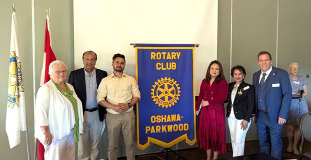 All sponsored by Rotarian Shashi Bhatia Dave Andrews spoke about the key aspects and expectations for Rotarians. He thanked Shashi Bhatia for sponsoring these three impressive candidates. He then asked Ted Morrison, Lennis Trotter & Shashi Bhatia to present them with their Rotary Pins and Welcome packet. Dave turned it over to Shashi to introduce our three new members. She told us of Amandeep’s transition from Waterloo Police to the pharmaceutical sector. He joined the police to help people and realized Rotary would be better suited to achieve this goal. We learned about John’s journey from Trinidad to Canada. He has experience with Rotary as a former member of Rotary-Scarborough. He is an entrepreneur and teacher in the Driving Instructor sector. Shashi touted Farzana’s extensive experience in both Bangladesh and Canada working to empower women. Through her real estate work she helps women become independent and successful. Each new member spoke about their personal journeys, and we enthusiastically welcomed them.