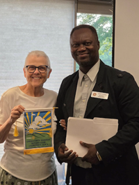 Madimba told us the story of how his influential teacher and mentor helped him get a scholarship to graduate school. This led him to understand the importance of community and service. His wife Ntumba and he are both educators and recently she was honoured for her entrepreneurship. They travelled to San Diego and while she was attending meetings Madimba looked up ‘nearest Rotary club’ on his phone. He connected with a member of the Chula Vista club and in true Rotarian style, became a San Diego tour guide for Madimba. Madimba received a Chula Vista club banner, and he presented this to VP Tess and the club. Rotarians ROCK!