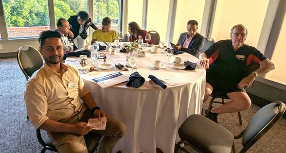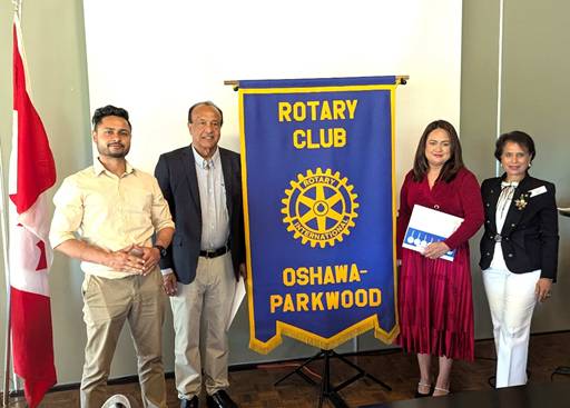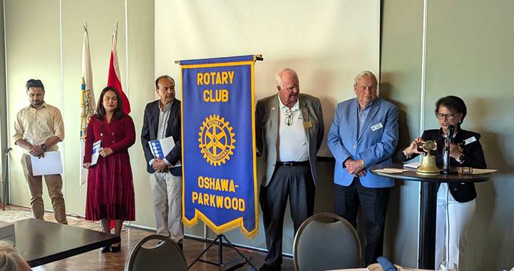 All sponsored by Rotarian Shashi Bhatia Dave Andrews spoke about the key aspects and expectations for Rotarians. He thanked Shashi Bhatia for sponsoring these three impressive candidates. He then asked Ted Morrison, Lennis Trotter & Shashi Bhatia to present them with their Rotary Pins and Welcome packet. Dave turned it over to Shashi to introduce our three new members. She told us of Amandeep’s transition from Waterloo Police to the pharmaceutical sector. He joined the police to help people and realized Rotary would be better suited to achieve this goal. We learned about John’s journey from Trinidad to Canada. He has experience with Rotary as a former member of Rotary-Scarborough. He is an entrepreneur and teacher in the Driving Instructor sector. Shashi touted Farzana’s extensive experience in both Bangladesh and Canada working to empower women. Through her real estate work she helps women become independent and successful. Each new member spoke about their personal journeys, and we enthusiastically welcomed them.