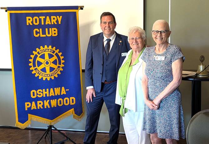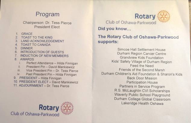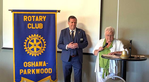 A message from (now) Past President Hilda Finnigan “It has been my privilege to serve as President of the Rotary Club of Oshawa Parkwood for the past year 2024/25.” This heartfelt statement resonated throughout her speech. She spoke of the Rotary family and her pride in the continued work being done locally and globally. She described the recent donation to Grandview Kids, in partnership with Lakeridge Health, that proves for an electrosurgical generator for the onsite OR. This operating room allows children to be treated onsite, in a familiar environment, and reduces wait times. Hilda’s experience as an OR nurse personalized this achievement. She recognized our international service that supports clean water, hygiene, and disease control initiatives. We also provided disaster relief to those in need. Hilda was especially proud of our work as the lead club for District 7070 in the WAKAM (West Africa Kenya Against Malaria) program. President Hilda reflected on the past year and thanked many club members for their contributions. She also thanked her husband, Allen, who stepped willingly when necessary to “ensure things get done.” “Thank you one and all ‘great Rotarians’ of the Rotary Club of Oshawa-Parkwood.”