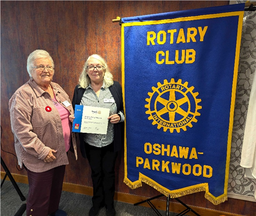 ANNOUNCEMENTS: Hilda – Some of our members are under the weather and we are thinking of them and hope they get well soon: Bill Creamer, Tess Pierce, and Pat Dyck. Hilda – Read a thank you note from Scott and Vicki Morrison for our helping them get back on their feet from their house fire. Hilda – we are all invited to the ground breaking ceremony of the Whitby Hospice (our club has made donations) on Nov 15 at 2 pm. At the District 7070 Conference held recently in Alliston, Past District Governor John Burns presented Hilda with the End Polio Certificate, signifying our club’s efforts to surpass our goal of donations to the Polio fund of The Rotary Foundation. Here is Hilda presenting the certificate to past President Linda Porritt.