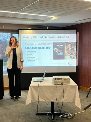 Linda Porritt presented a thank you from Denise House. SGT AT ARMS: Ted Morrison ACE OF SPADES: The draw was won by Robbie Larocque. The 8 of Clubs was drawn. One less card left, for next regular weekly meeting. The pot grows even bigger. HAPPY BUCKS: Thank you to Ted Morrison for collecting our Happy Bucks. Shashi B – very happy to see so many young people joining us at Rotary in recent days, it is so nice to see. Bob S (Stewy) – happy to be give Maple Syrup to his staff. However, one staff member would have preferred Rum which it was first thought to be. Maple Syrup is a awesome alternate. David P – is happy to be here Lennis T – is happy to have Pam here this evening Tess P – is happy that her Chemo is over very soon Larry H – is happy that upon his return to his cottage in recent days he noted that the tree damage was not too bad. But they did spend many hours of clean in the coming days/weeks. He is also happy he was able to sell 10 tickets for the upcoming reverse draw. Larry shared an amusing Mother-in-law story about hearing her children when they thought her hearing aid was missing?! Bill C. – shared that, Sue McK. Was able to find a home purchase in Vancouver. Robert K. – is happy to share an update from the recent Oshawa Library Spring book sale. Hilda F. – is very happy to see such a turn out for the meeting Ted M. – is happy to have a date for his shoulder replacement in July of this year. He will be unable to drive for a few weeks post-surgery. Ted announced that Sharron is having issues hearing in her good ear after the taking ear prescribed ear drops. SPEAKER: Pamela Loveless – Lakeridge Health – Manager of Philanthropy Introduced by David Penney, Pamela has dedicated over 15 years to the charitable sector, working with organizations she deeply cares about, such as the Salvation Army, Eva’s Initiatives for Homeless Youth, and the Alzheimer Society of York Region. She attributes he meaningful and inspiring journey to the guidance of savvy mentors and support of passionate donors. Pamela obtained he BA from Dalhousie University and furthered her education at Toronto Metropolitan University through their Fundraising Management program. An avid community volunteer, she has served at the Warehouse mission, 514 Regent Park, and Victim Services of Durham Region. Pamela, a proud resident of Oshawa, is a dedicated member of the Lakeridge Health foundation team serving as the Manager of Philanthropy. Her commitment to raising funds for local healthcare is deeply personal. Inspired by her late father, who served as a chaplain at her hometown hospital for many years, Pamela has also experienced firsthand the profound impact of exceptional healthcare close to home when her husband received treatment at the Durham Regional Cancer Centre. This personal connection fuels her passion and dedication to ensuring that others in her community receive the compassionate care they need. Pamela, shared regrets from Yves Gadler who was scheduled to attend this evening but was under the weather. What is happening at Lakeridge Health Oshawa, our Rotary Club has donated some $165,000.00 since 1991 a remarkable accomplishment for our members. These donations over time have allowed the purchase of a surgical robot, birthing suite and smart IV pumps to name a few. These donations have a lasting impact on the staff at Lakeridge Health Oshawa not only do they assist with the performance of their jobs it has allowed Lakeridge Health Oshawa to attract the best talent from medical schools. People want to work here in Oshawa. A recent fund-raising campaign sought a goal of $20 million. This fund raiser has just been completed with a total of $21 million being raised. A very recent and remarkable accomplishment at the hospital in the new PET CT Scan, a very welcomed addition to the diagnostics equipment available. Before the arrival of the PET CT Scan patients would need to make the day long journey to Toronto for such diagnostics. Now they are available in our city, amazing. This equipment has had and will have great impacts on the lives of our neighbours and community. The next avenue for medical care includes a collaboration with Grandview Kid’s. This new program will introduce a special room at the new Grandview where the medical care comes to Grandview to simplify the care an anxiety that go along with travel to medical appointments for the young people and their families at Grandview. These young people can have complex needs and simple medical procedures will soon be able to occur in a hospital like setting at Grandview proper. A brand-new fund-raising campaign is just starting, on March 11, 2025 a fundraising campaign seeking to raise $1 million dollars to outfit the special room with all the needed medical suppliers and equipment to allow the patients and their caregivers to attend Grandview a familiar setting for medial procedures. Pamela described the care model as ‘One System, Best Health’. This is just a beginning of collaboration efforts perhaps dental care could be introduced going forward, this is just the beginning. President Hilda thanked Pamela for the amazing presentation on where Lakeridge Health Oshawa has been and where they are going with respect to fundraising and patient care.