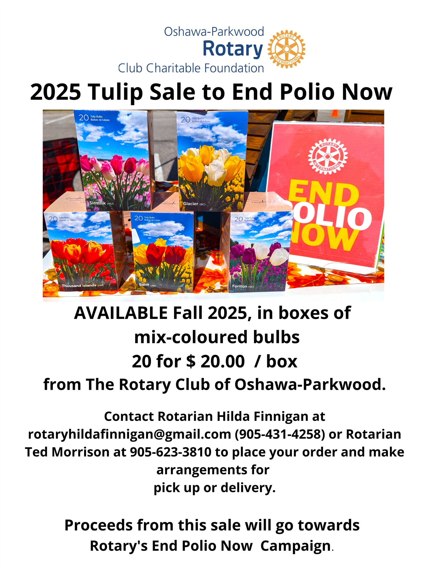 You can order a box or more of these Canadian grown tulip bulbs and help Rotary End Polio Now. Rotarians have helped immunize more than 2.5 billion children against polio in 122 countries. We are 99.9% polio free in the world, but we need your help to get to the finish line. The End Polio Now project, perhaps the largest of its kind ever undertaken by a service organization, has been hugely successful with only a few very small pockets of the disease remaining.