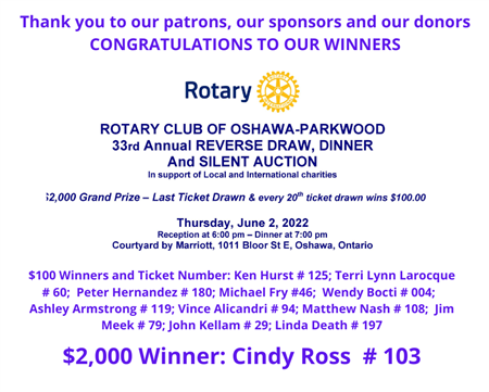 Thank you very much to the President of the Rotary Club of Oshawa Peter Hernandez for taking all of our pictures and being the official photographer at The Rotary Club of Oshawa-Parkwood's reverse draw dinner and silent auction held June 2, 2022 at the Marriott in Oshawa, Ontario. Thank you to all of our patrons all of our sponsors. The Rotary Club of Oshawa-Parkwood thanks you . This money which will allow us to do good things in our community here in Oshawa, in Durham region in Ontario , Canada, and throughout the world.